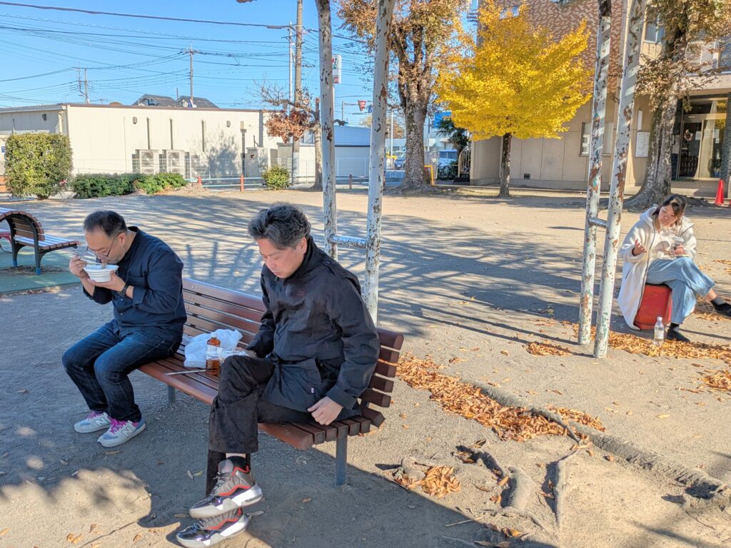 当日はニュートウゲ入りする前の午前中にリハーサルを行いました。お昼ごはんはスタジオ近くのコンビニで買ってそのすぐ近くの公園で。仲良さそうに見えない距離感…(´ー`)