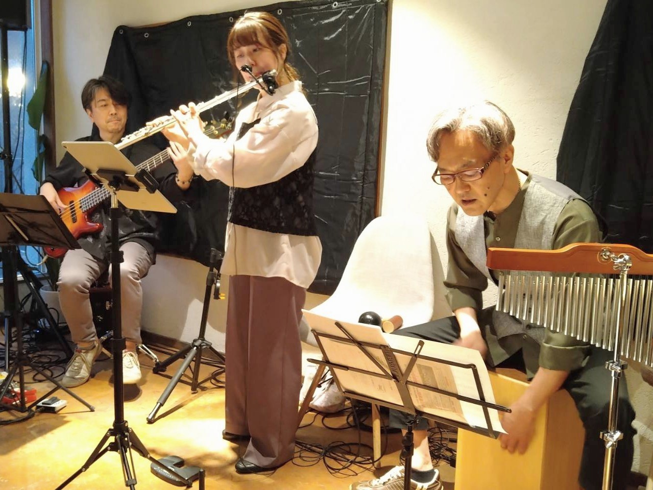 フルート&ベース&パーカッションという珍しいトリオで、懐かしの歌謡曲、アニメ曲、ジャズやラテン、クラシック曲など幅広くお届けしました。